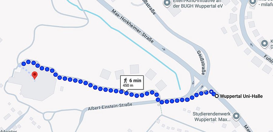 Auf dem Bild seht ihr den Standort von Gebäude V & W. Hier befindet sich unser Fachschaftsraum und die Fachgruppen der Chemie & Biologie. Ihr erkennt das Gebäude an der weißen Fassade und der roten Skulptur vor dem Eingangsbereich. Es ist das erste Gebäude auf der linken Seite auf dem Weg von der Unihalle zur Universität. Unser Raum befindet sich im 2. OG mit der Bezeichnung VW.10.092.